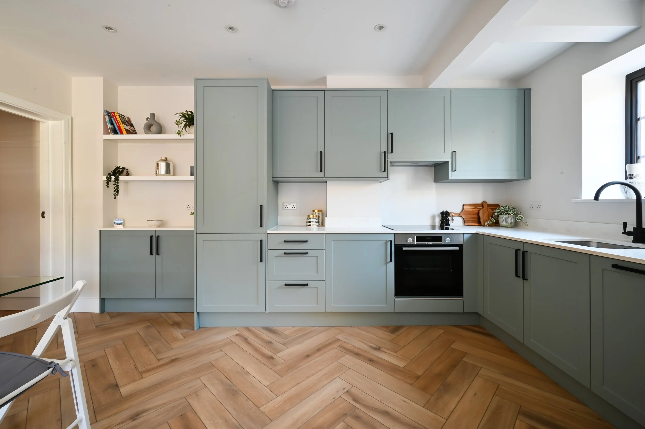 We were brought on board early to help shape the layout and design direction, working alongside the architect and builder to maximise space, flow & light. We developed a cohesive interior scheme across the kitchen, living areas, bedrooms, bathroom, and courtyard garden—focusing on finishes that would appeal to buyers while staying within the developer’s budget. We produced detailed specifications, sourced all fixtures and fittings, and provided ongoing design support throughout the build to ensure consistency and market-ready results. The standout feature, a bespoke oriel window, was designed to enhance both the interior experience and buyer appeal.
